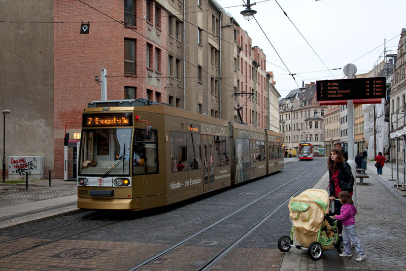 | Auf dem Weg zur Grenzstraße fuhr Tw 650 auf der Linie 7. Halle (Saale) | Marktplatz, 4. Juli 2011 |