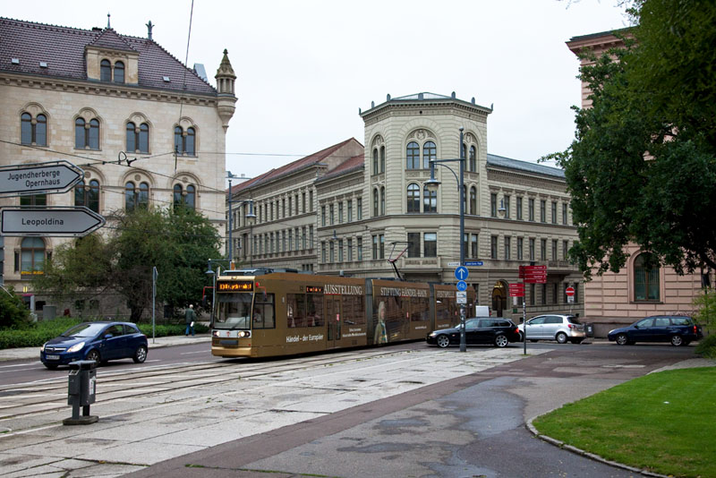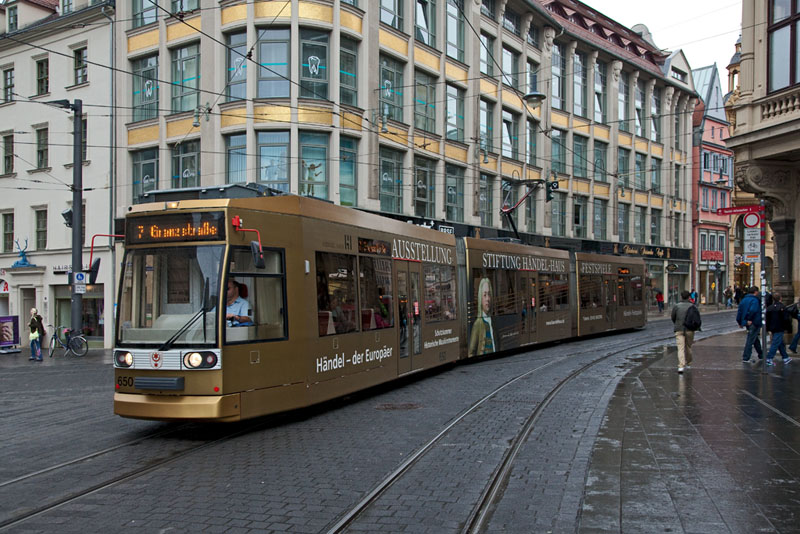 | Wieder die goldene "Händel-Tram" 650, auf der Linie 7 zur Grenzstraße. Halle (Saale) | Franckeplatz, 4. Juli 2011 |