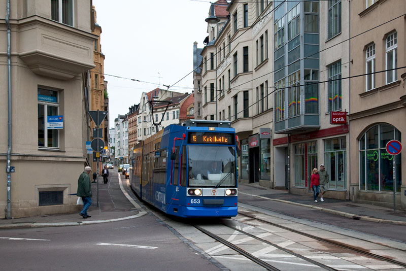 | Die Überlandlinie 5 nach Kröllwitz mit dem Triebwagen 653. Halle (Saale) | Joliot-Curie-Platz, 3. Juli 2011 |