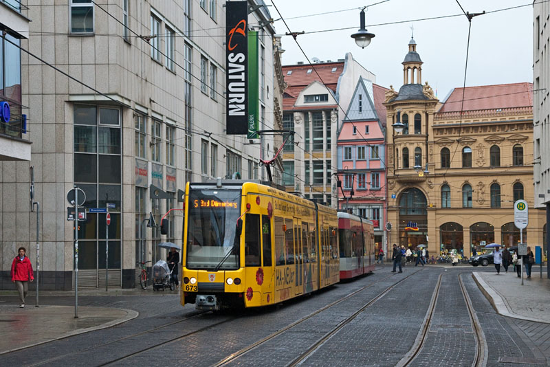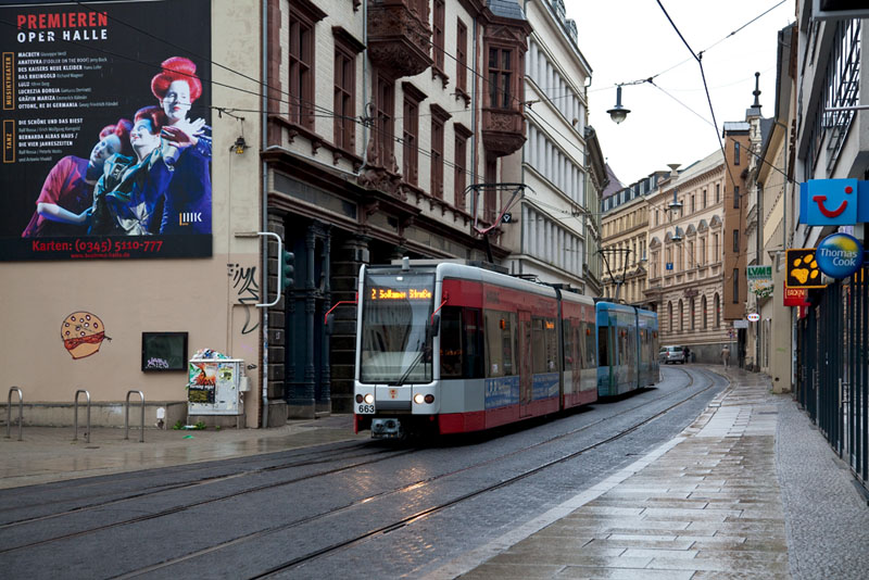 | Nach Bad Dürrenberg über Schkopau, Merseburg und Leuna fuhren Tw 673 und Schwester auf der Überlandlinie 5. Halle (Saale) | Große Steinstraße, 4. Juli 2011 |