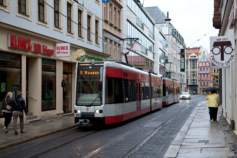 | Die MGT-K-Traktion mit Tw 681 auf dem Weg nach Beesen der Linie 2. Halle (Saale) | Große Steinstraße, 3. Juli 2011 |