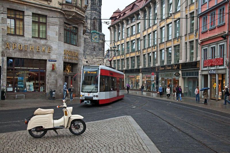 | Osteuropäische Produkte auf einem Blick – Schwalbe-Moped (DDR) und Tatra-Tram (CSSR)! Halle (Saale) | Große Steinstraße, 4. Juli 2011 |