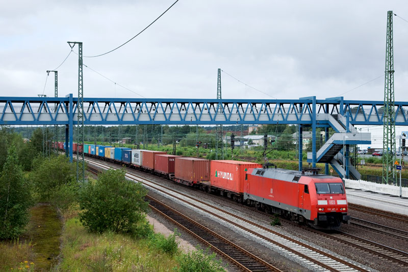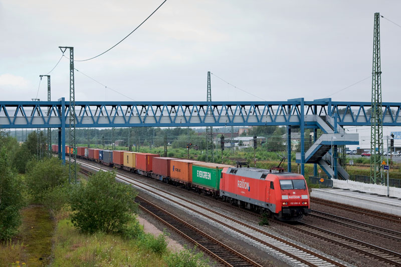 | Ein weiterer Containerzug nach Hamburg, mit der frisch hauptuntersuchten 152 004-8. Buchholz (i.d. Nordheide), 13. August 2011 |