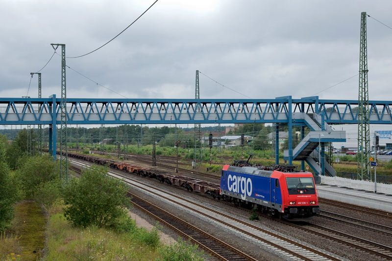 | Mit wenig Containern am Zugende rollte die SBB Cargo 482 036-1 auch in Richtung Maschen. Buchholz (i.d. Nordheide), 13. August 2011 |