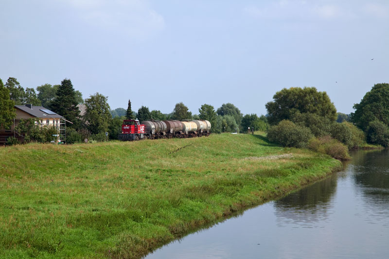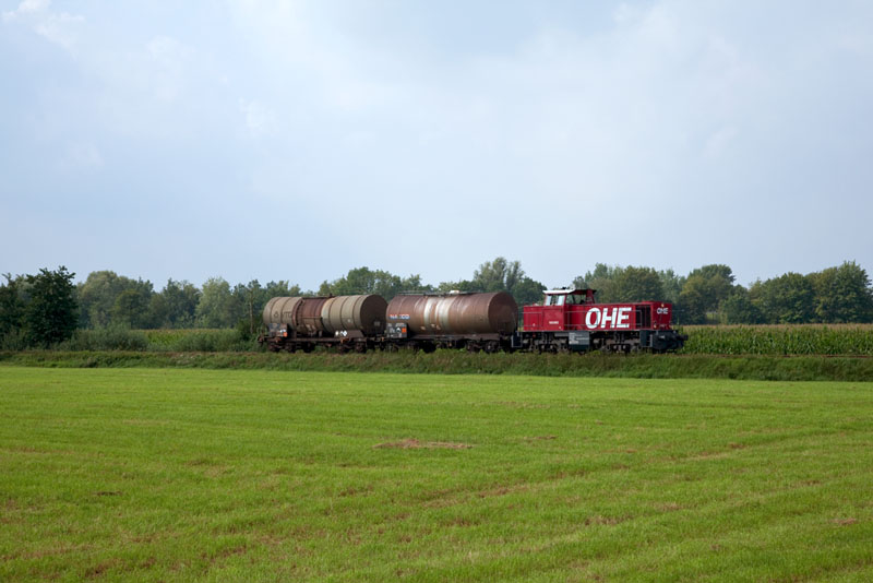 | Und rangierte wieder mit anderen Kesselwagen in den Anschluss herein. Niedermarschacht, 24. August 2011 |