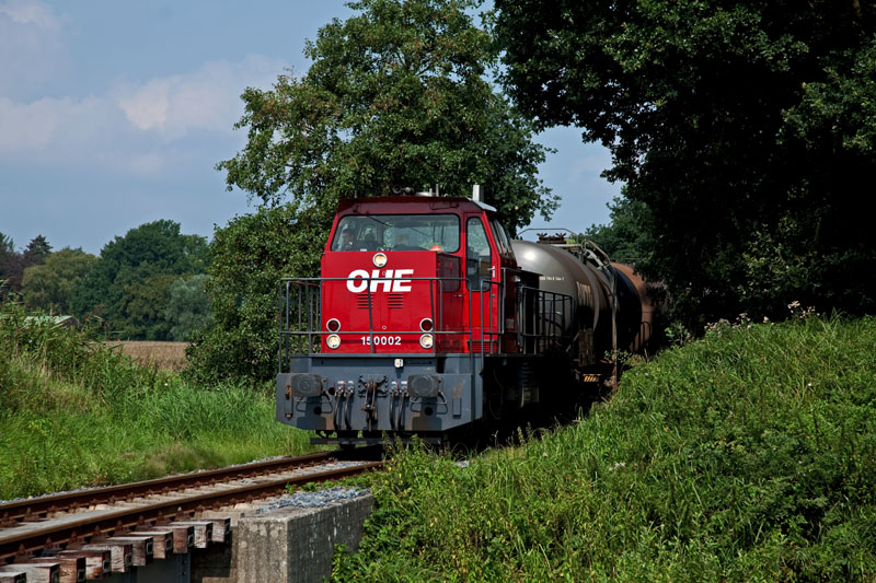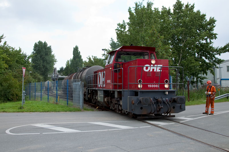 | Die MaK-Diesellok 150002 der OHE rangierte einen Kesselwagen im OHE-Teil von Winsen (Luhe). Winsen (Luhe), 24. August 2011 |
