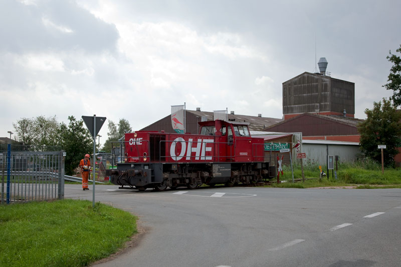 | Nun steuerte der Lokrangierführer seine Lok per Fernsteuerung über die Straße. Niedermarschacht, 24. August 2011 |
