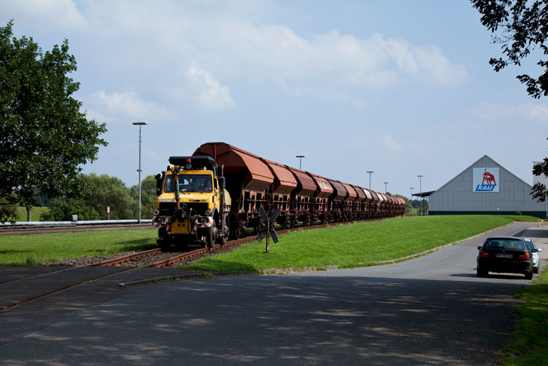 | Im Anschluß des Kanalhafens stand eine Zweiwege-Unimog vor einer langen Reihe Kaliwagen! Hafen Nettelberg, 24. August 2011 |