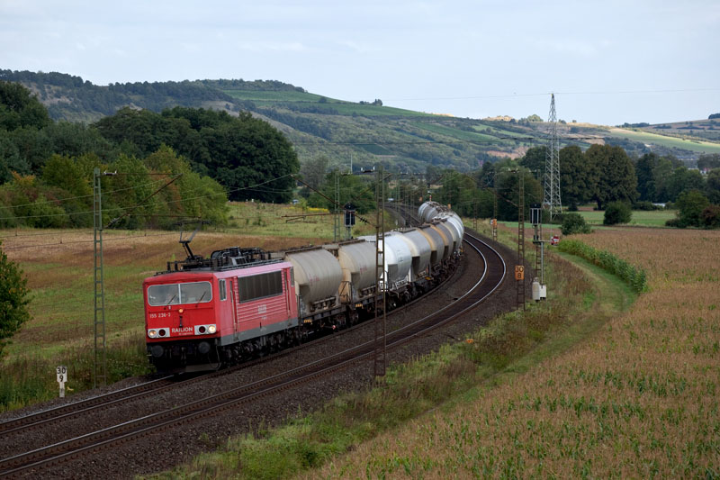 | Einen Wolkenschaden erlitt dieser schöne Staubgutzug mit der 155 236-3. Staustufe Harrbach, 30. August 2011 |