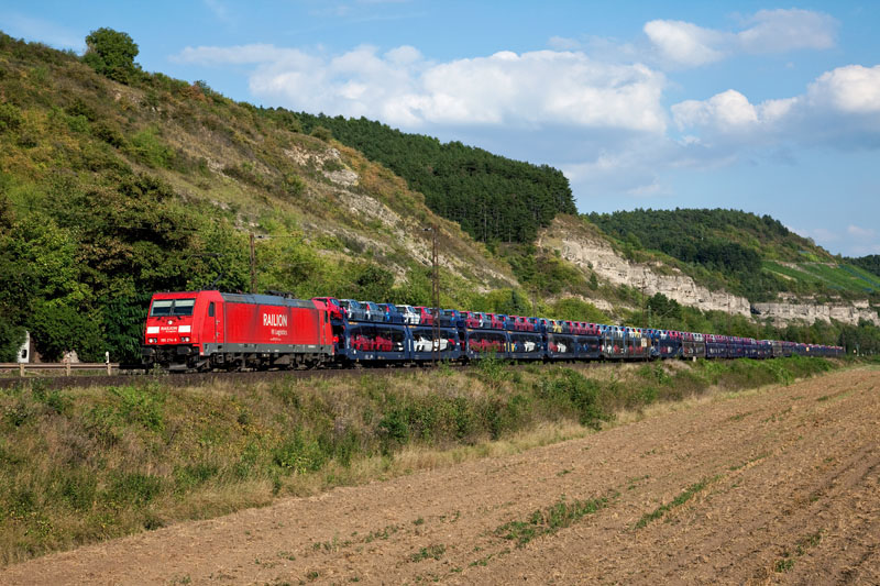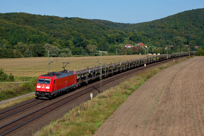 | Donnerwetter, noch ein Autologistiker – diesmal mit der 185 004-9. Staustufe Harrbach, 31. August 2011 |
