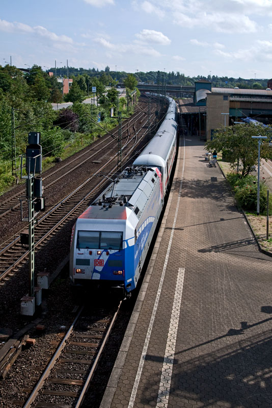 | Die 101 142-8 rollte mit ihrem InterCity am ehemaligen DB-Ausbesserungswerk vorbei. Hamburg-Harburg, 10. September 2011 |