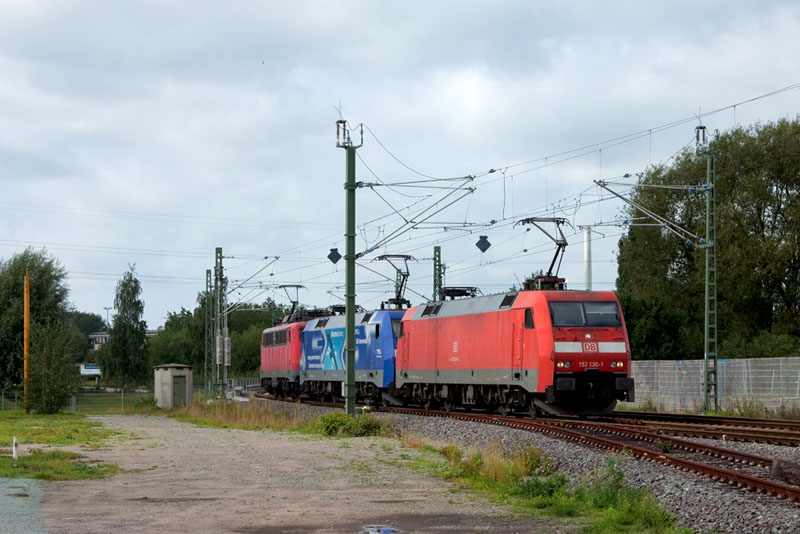 Wenig später kamen alle drei Loks, die Züge reingebracht haben, aufgebügelt heraus: 152 130-1, 152 138-4 und 139 309-9. Hamburg-Hohe Schaar, 10. September 2011 |