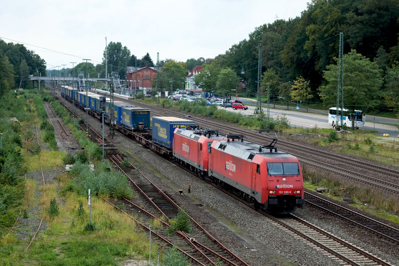 | Jede Menge 152er heute – hier die 152 021-2 mit einem Containerzug in den Hafen. Tostedt, 11. September 2011 |