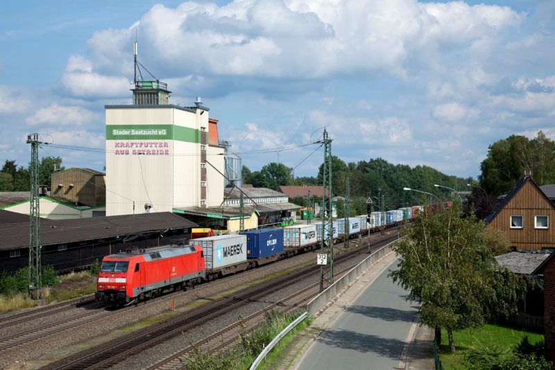 | Etliche Container aus dem Hamburger Hafen hatte die 152 149-1 am Haken. Tostedt, 11. September 2011 |