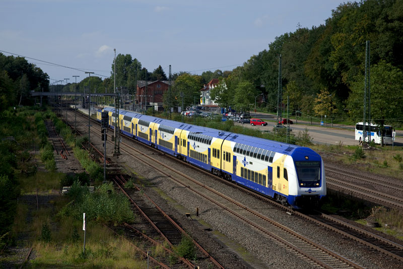 | Ein metronom nach Hamburg von Bremen verläßt den Bahnhof Tostedt. Tostedt, 11. September 2011 |