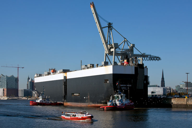 | Währenddessen kam das Ro/Ro-Schiff GREEN RIDGE, mit Hilfe der Schlepper legte es am Unikai an. Hamburg Unikai, 1. Oktober 2011 |