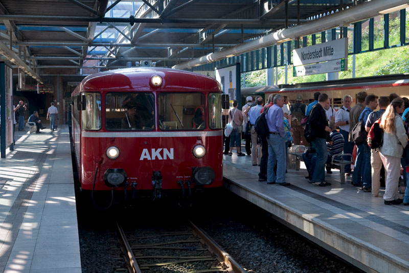 Einträchtig stehen VT 308 / 309 der AKN und der T-Wagenzug der Hochbahn nebeneinander. |