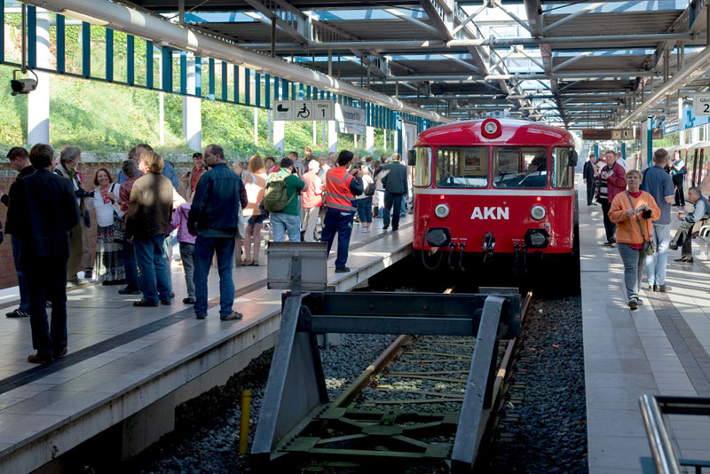 | Nun fuhr "Kuddl" wieder aus dem Trogbahnhof in Richtung Ulzburg aus. Norderstedt Mitte, 2. Oktober 2011 |
