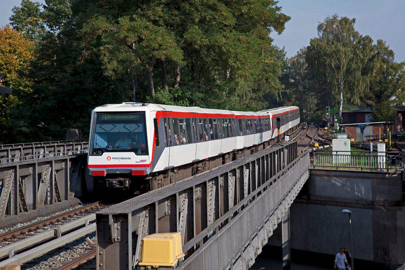 | Einfahrender DT4-Achtwagenzug auf der U1 nach Großhansdorf. Hamburg | Kellinghusenstraße, 2. Oktober 2011 |