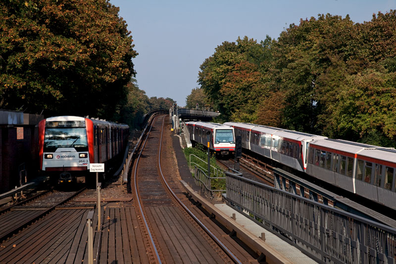 | U-Bahnen ohne Ende… Zwei U1-DT4-Züge rechts und einfahrender DT3E-Zug auf der U3 links. Hamburg | Eppendorfer Baum, 2. Oktober 2011 |