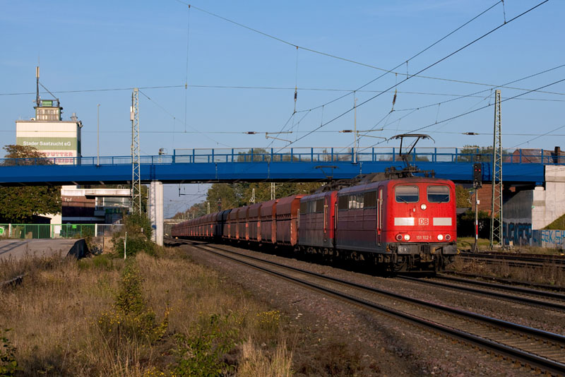| Ganz selten verirren sich die Erzbomber so wie dieser mit der 151 102-1 und 151 100-5 auf diese Strecke. Tostedt, 22. Oktober 2011 |