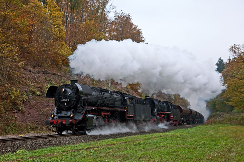 | Mit zighundert Tonnen Zuglast tobten 44 2546 und 44 1486 aus dem Förthaer Tunnel heraus… Förtha, 27. Oktober 2011 |