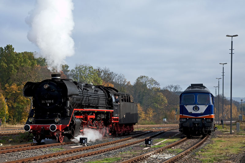 | Die 232 103-2 von raildox wurde von der 44 1486 der Staßfurter begrüßt. Bad Salzungen, 27. Oktober 2011 |