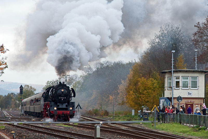 | Auf dem Weg nach Meiningen war die 41 1144 mit ihrem Personenzug. Block Höpfen, 27. Oktober 2011 |