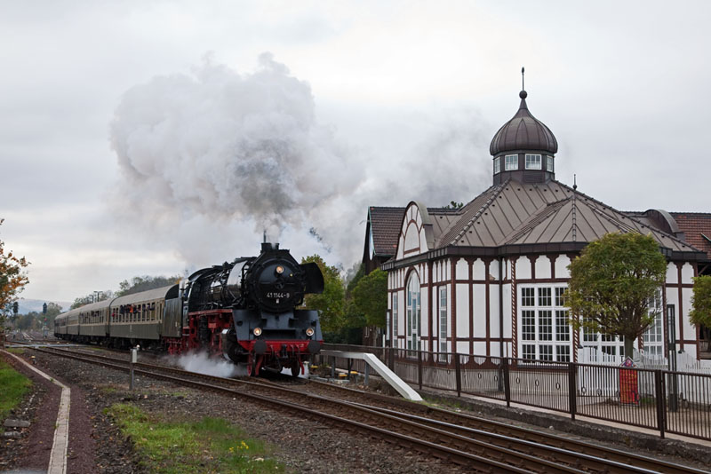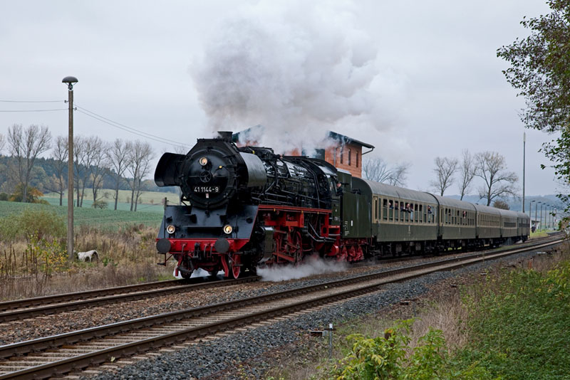 | Die 41 1144 mit ihrem Personenzug bei der Ausfahrt. Oberrohn, 27. Oktober 2011 |