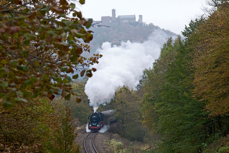 | Die 41 1144 mit ihrem "D-Zug" vor der bekannten Wartburg… Block Höpfen, 27. Oktober 2011 |