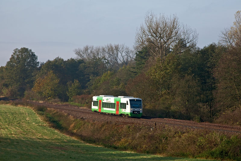 | Die RegioShuttle der Süd-Thüringen-Bahn wickeln den Regionalverkehr auf dieser Strecke ab – VT 110 nach Eisenach. Oberrohn, 27. Oktober 2011 |
