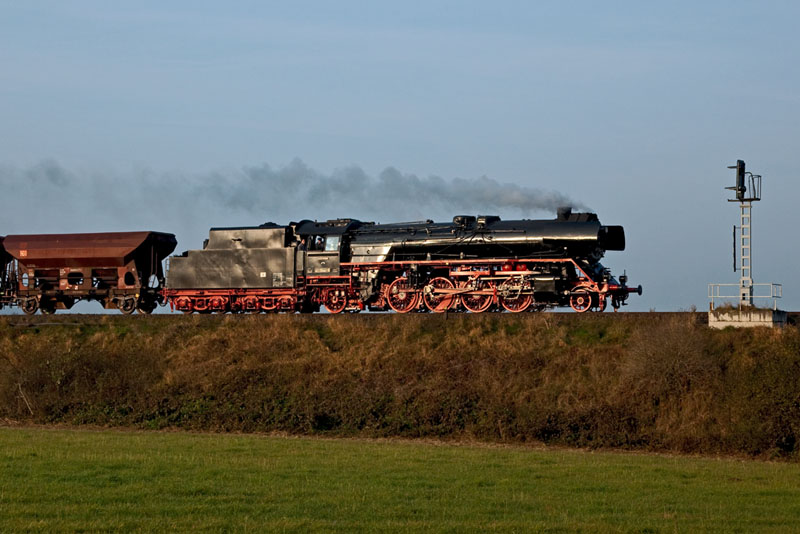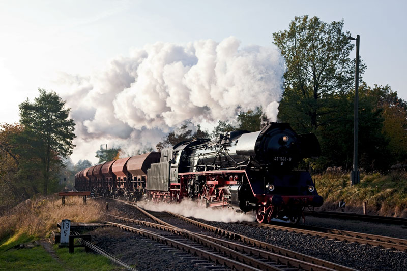 | Eine fulminante Durchfahrt des Güterzuges mit der 41 1144. Marksuhl, 28. Oktober 2011 |