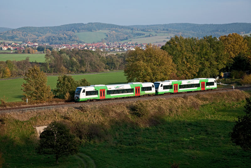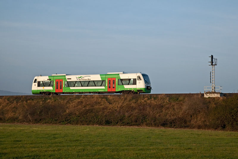 | Ein RegioShuttle der Süd-Thüringen-Bahn auf dem Weg nach Eisenach – VT 102. Bei Bad Salzungen, 28. Oktober 2011 |