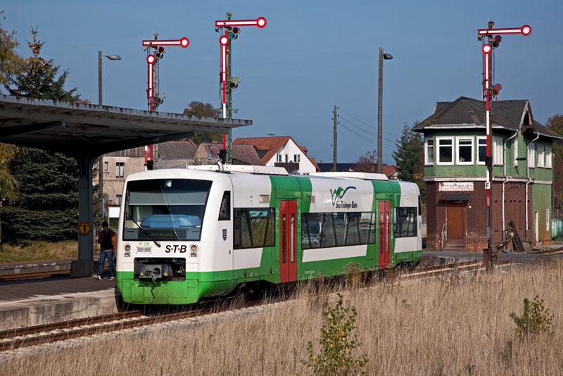 | Ein weiterer RegioShuttle der Süd-Thüringen-Bahn im Bahnhof wartete auf die Ausfahrt – VT 126. Wernshausen, 28. Oktober 2011 |