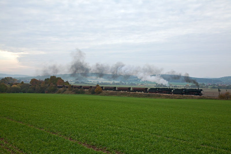 | Durch das weitläufige Werratal rollten 44 2546 und 44 1486 mit ihrem 2.500-Tonner. Burkhardtroda, 29. Oktober 2011 |