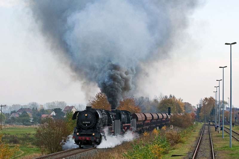 | 44 2546 und 44 1486 mit dem "Abschlusszug" des dreitägigen Spektakels – mit ca. 2.500 Tonnen Kies! Immelborn, 29. Oktober 2011 |