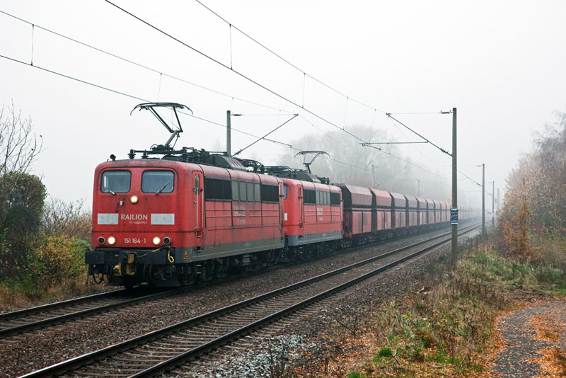 | Noch ein Massengutzug, der Erzpark nach Beddingen mit 151 164-1 und 151 163-3. Hamburg-Moorburg, 9. November 2011 |