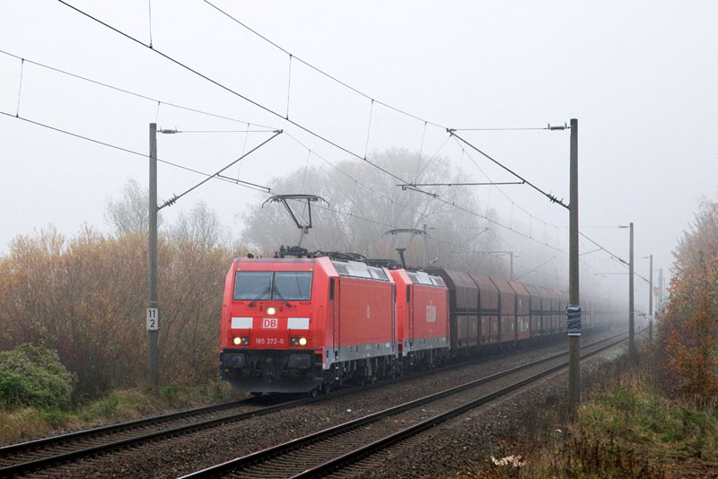 | Einen schweren Kohlepark wuppten 185 372-0 und 185 219-3 gemeinsam. Hamburg-Moorburg, 9. November 2011 |