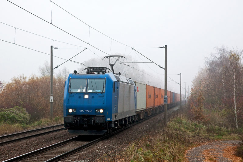 | Auf dem Gegengleis fuhr die 185 522-0 der ITL vor einem Containerzug aus. Hamburg-Moorburg, 9. November 2011 |