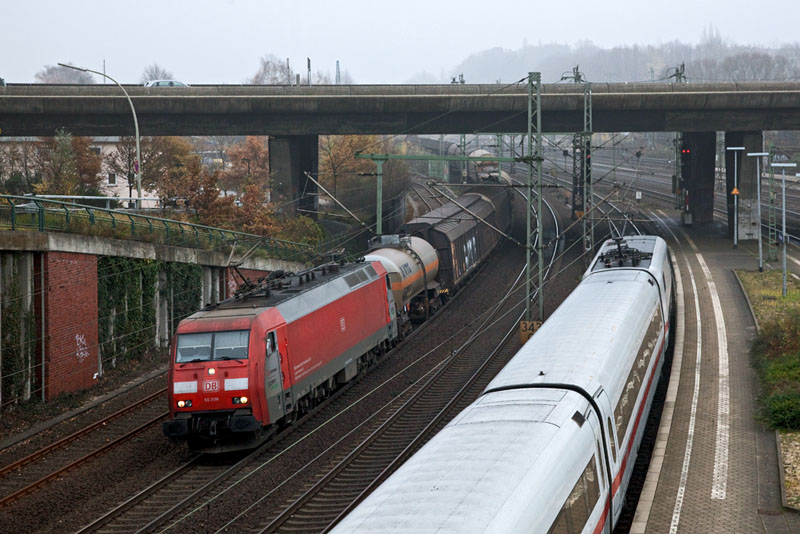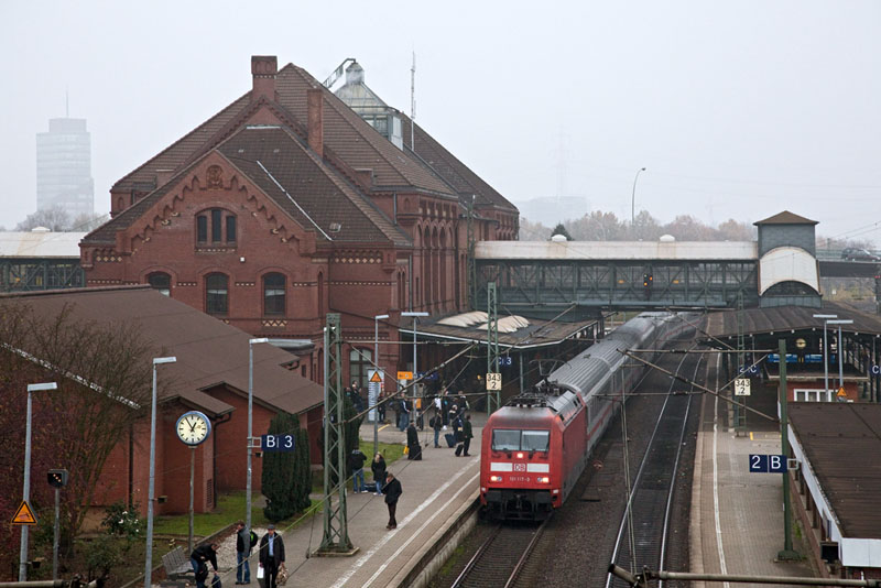 | Mit einem InterCity fuhr die versiffte 101 117-0 in den Bahnhof ein. Hamburg-Harburg, 18. November 2011 |