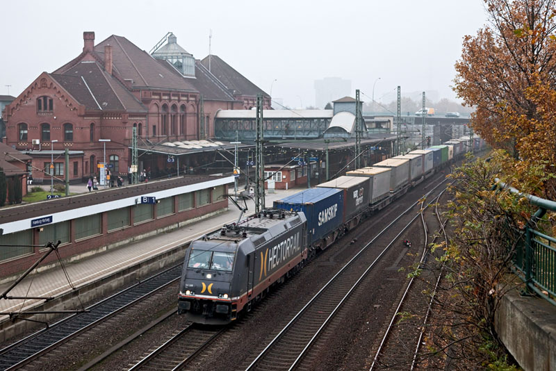 | Einen recht leeren Containerzug brachte die 186 133-5 der OHE herein. Hamburg-Moorburg, 18. November 2011 |
