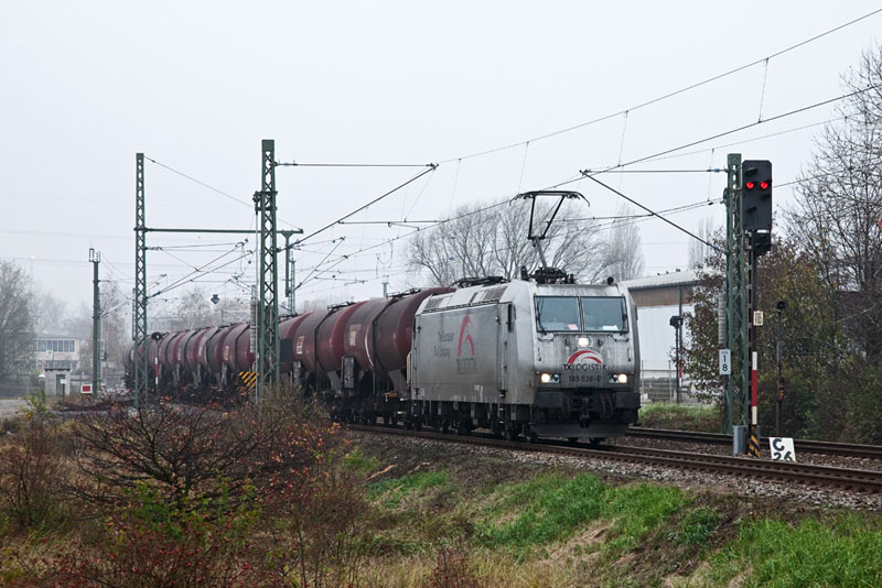 | Dreckig war die 185 538-6 vor einem Kesselwagenzug bei der Ausfahrt. Hamburg-Hohe Schaar, 18. November 2011 |