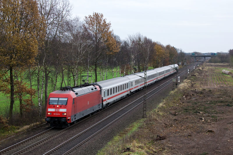 | Die ehemalige "Ferrero"-Werbelok 101 040-4 mit einem IC nach Hamburg. Borstel, 26. November 2011 |