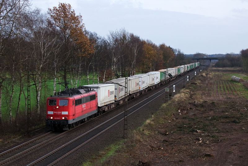 | Einen DB Schenker/Hangartner-KLV-Zug nach Hamburg hatte die 151 079-1 am Haken. Borstel, 26. November 2011 |