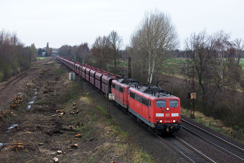 | Der Erzpark von Hansaport nach Beddingen mit den AK-Loks 151 104-7 und 151 094-0. Borstel, 26. November 2011 |