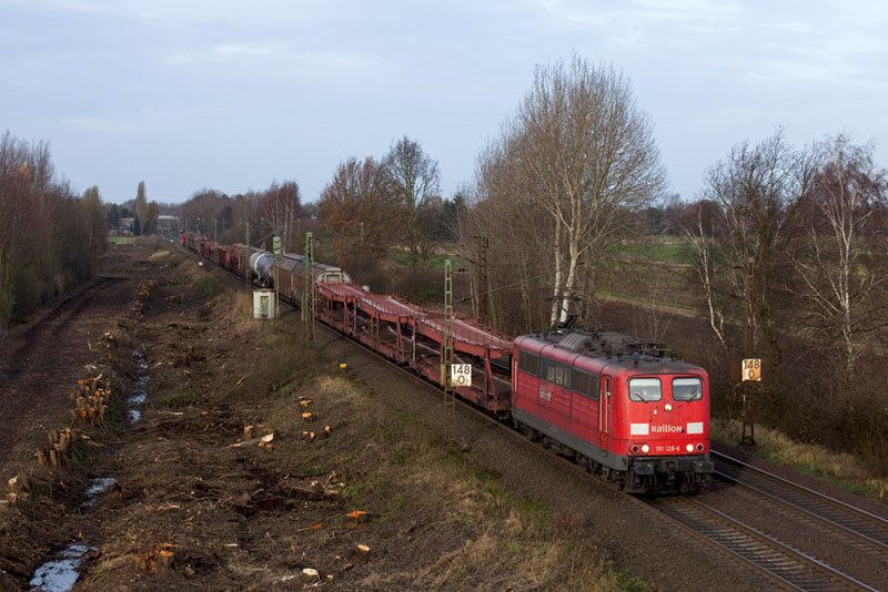 | Einen gemischten Güterzug hatte die 151 128-6 mit alter Railion-Beschriftung am Haken. Borstel, 26. November 2011 |