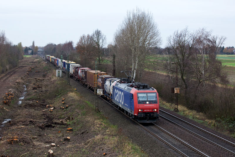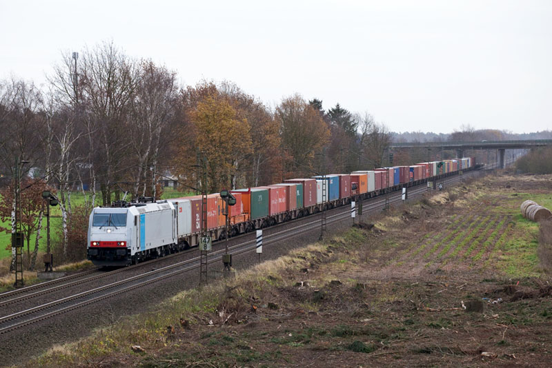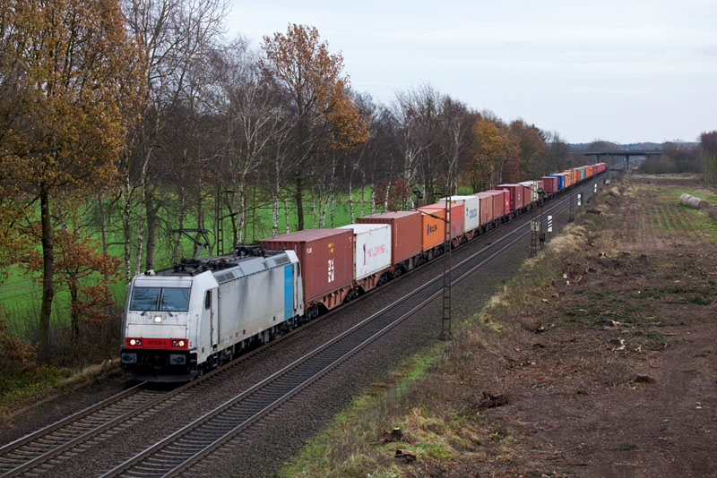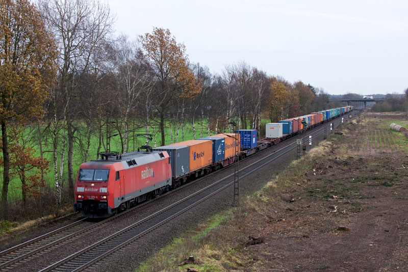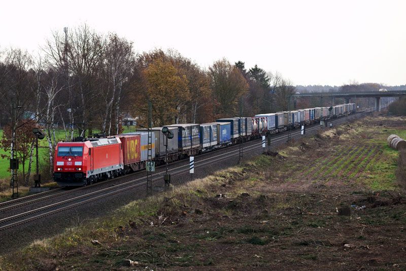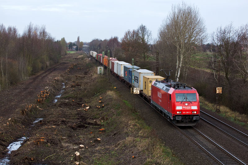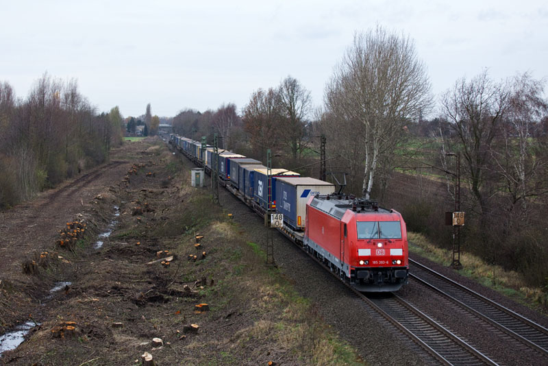 | Einen Containerzug hatte 185 280-5. Wegen dem dreigleisigen Ausbau wurde hier eine breite Schneise geschlagen. Borstel, 26. November 2011 |