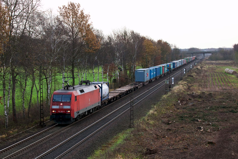 | Aus Richtung Hannover kam die 152 169-9 mit einem Containerzug. Borstel, 26. November 2011 |