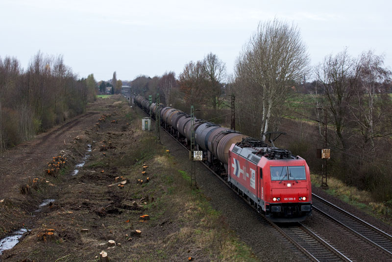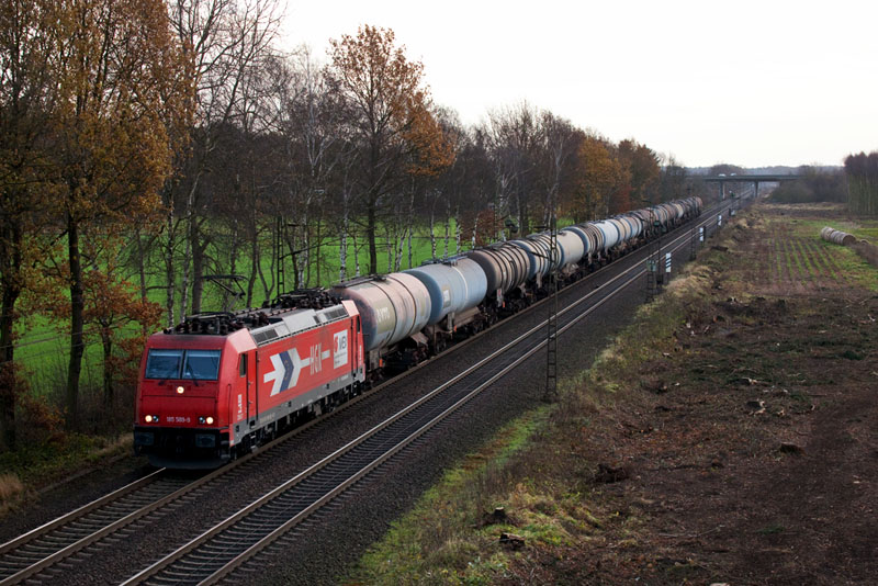 | Die 185 589-9 kam wieder von Hamburg zurück, mit einem anderen Kesselwagenzug. Borstel, 26. November 2011 |