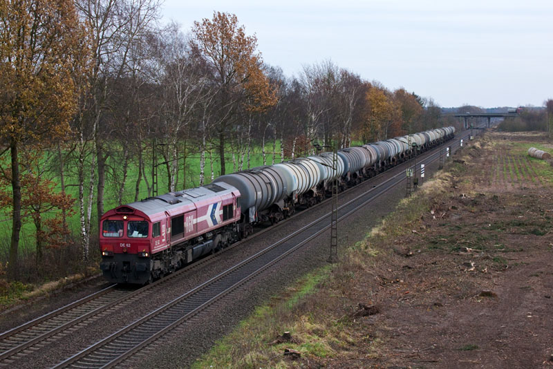 | Ein Kesselwagenzug nach Hamburg mit der HGK DE 62, einer Class 66. Borstel, 26. November 2011 |